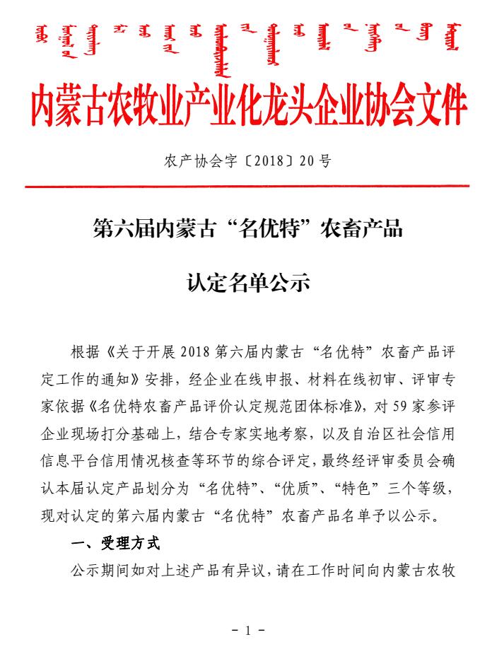 第六屆內(nèi)蒙古“名優(yōu)特”農(nóng)畜產(chǎn)品的公示
