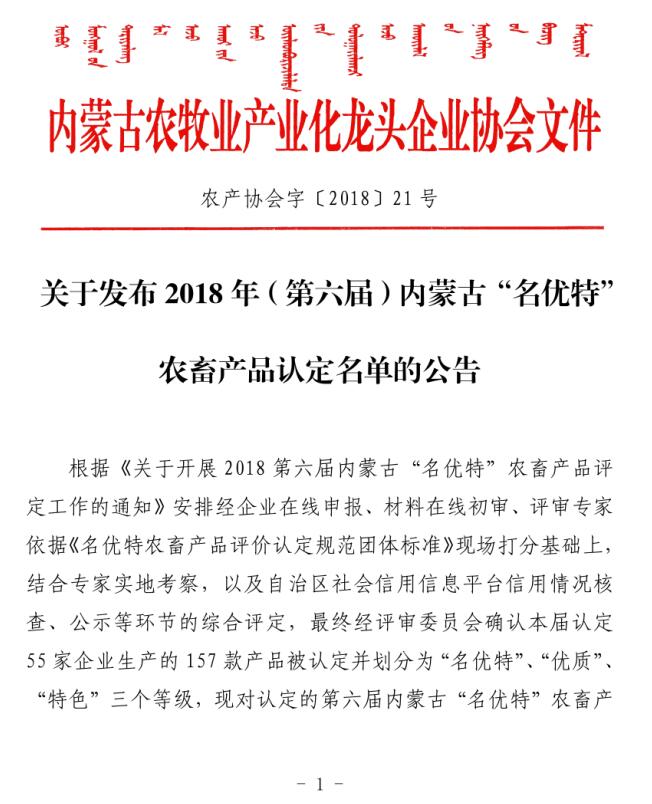 標題:關于發(fā)布2018年(第六屆)內蒙古“名優(yōu)特”農畜產品認定名單的公告