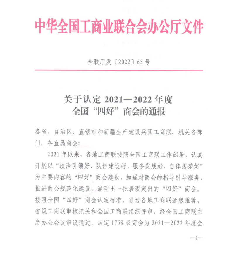 近日,中華全國工商業(yè)聯(lián)合會辦公廳發(fā)布《關于認定20212022年度全國“四好”商會的通報》,通報指出,按照全國“四好”商會認定標準,在各地工商聯(lián)逐級推薦、省級工商聯(lián)審核把關、全國工商聯(lián)組織評審的基礎上,經(jīng)全國工商聯(lián)主席辦公會議審議通過,評選出2021-2022年度全國“四好”商會。內(nèi)蒙古農(nóng)牧業(yè)產(chǎn)業(yè)化龍頭企業(yè)協(xié)會等42家商(協(xié))會榮獲2021-2022年度全國“四好”商會榮譽稱號!