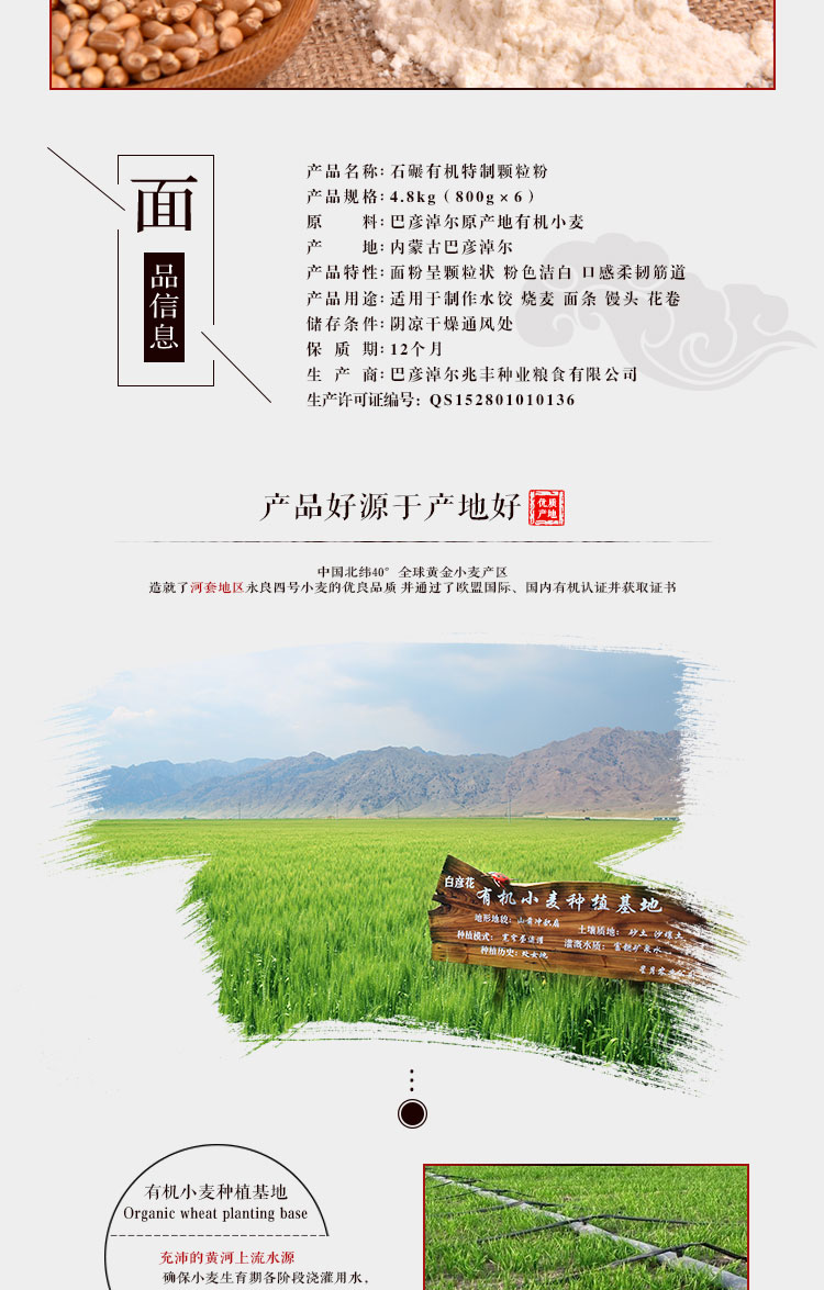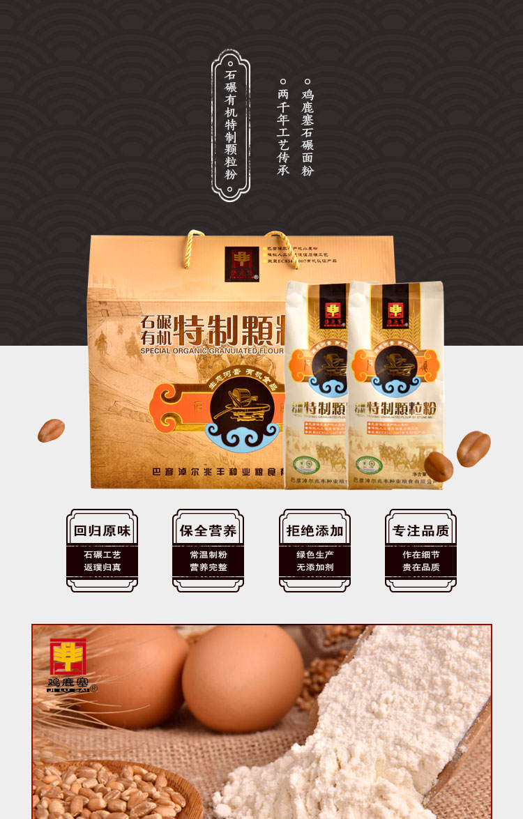 產(chǎn)品名稱:雞鹿塞 石碾有機特制顆粒粉 精品禮盒 4.8kg 河套面粉 餃子粉